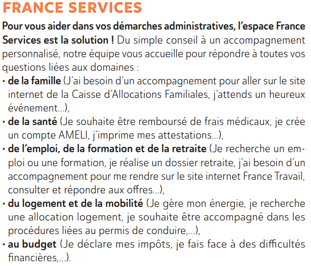 Pour vous aider dans vos démarches administratives, l’espace France Services est la solution ! Du simple conseil à un accompagnement personnalisé, notre équipe vous accueille pour répondre à toutes vos questions liées aux domaines :