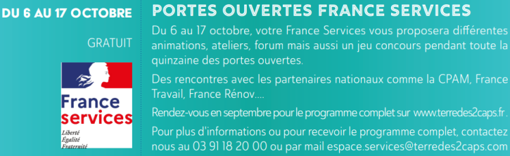Portes ouvertes France Services du 6 au 17 octobre, programme complet sur www.terredes2caps.fr