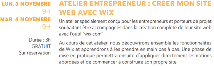 Un atelier spécialement conçu pour les entrepreneurs et porteurs de projet souhaitant être accompagnés dans la création complète de leur site web avec l’outil “wix.com”. Au cours de cet atelier, nous découvrirons ensemble les fonctionnalités de Wix et apprendrons à les prendre en main pas à pas. Une phase de mise en pratique permettra ensuite d’appliquer directement les notions abordées et de commencer à construire son propre site.