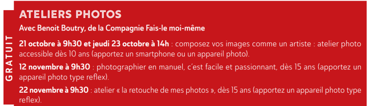 22 novembre à 9h30 : atelier « la retouche de mes photos », dès 15 ans (apportez un appareil photo type reflex).